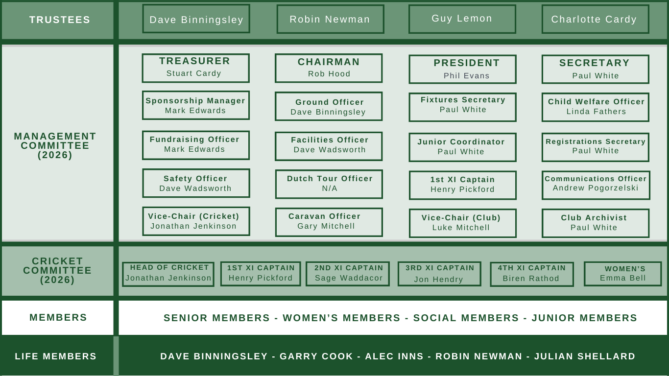The day-to-day running of the cricket club is undertaken by the Management Committee and details of the respective roles for the 2026 season are shown in the below table.